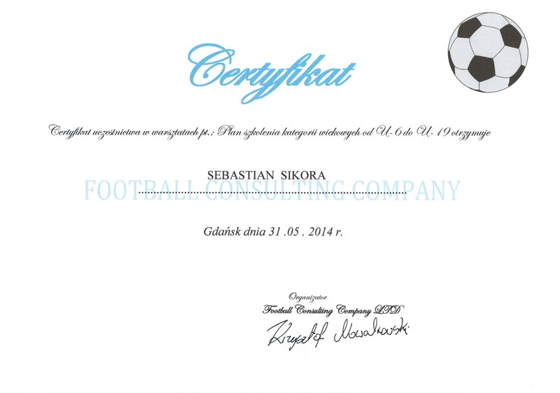 Chciałbym poinformować, że wciąż podnoszę kwalifikacje i staram się być na bieżąco z nowinkami europejskiej piłki nożnej. Dlatego też w dniu 24 listopada 2012 roku uczestniczyłem w I Kongresie Trenerów Piłki Nożnej, który się odbył w Warszawie. Wykładowcami byli m.in. trenerzy z Belgii i Holandii, którzy w swoich wypowiedziach potwierdzili przyjętą przez Naszą Szkółkę koncepcję, czyli, aby uczyć dzieci przez zabawę. Następne szkolenie w Gdańsku w dniach 15 i 16 grudnia 2012 roku!